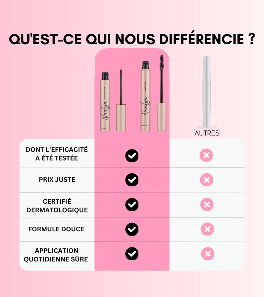 Chez Naalya, nous mettons un point d’honneur à créer des produits doux et sûrs pour tous types de cils et peaux. Nos sérums sont formulés avec des ingrédients soigneusement sélectionnés pour nourrir, fortifier et protéger vos cils et sourcils.